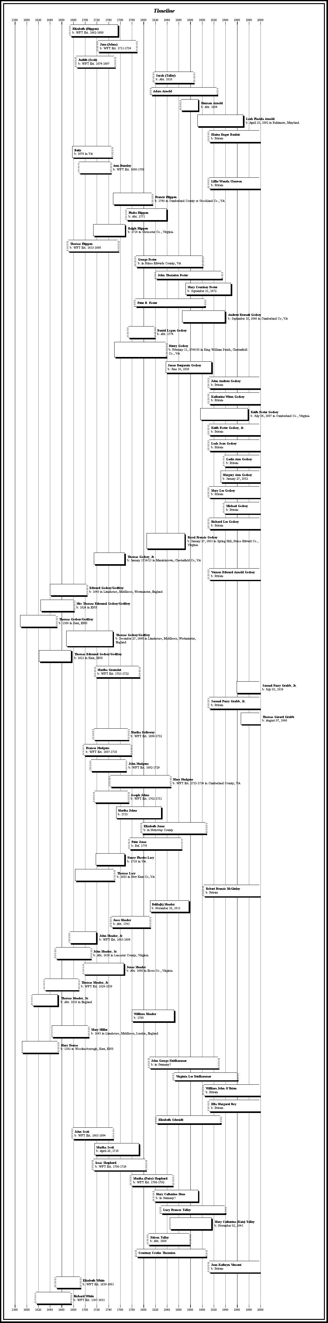 The following is a timeline view of our family members. Each box represents the lifespan of the family member. Dashes on the edge of the box represent vagueness about the date of the birth or death of the family member.